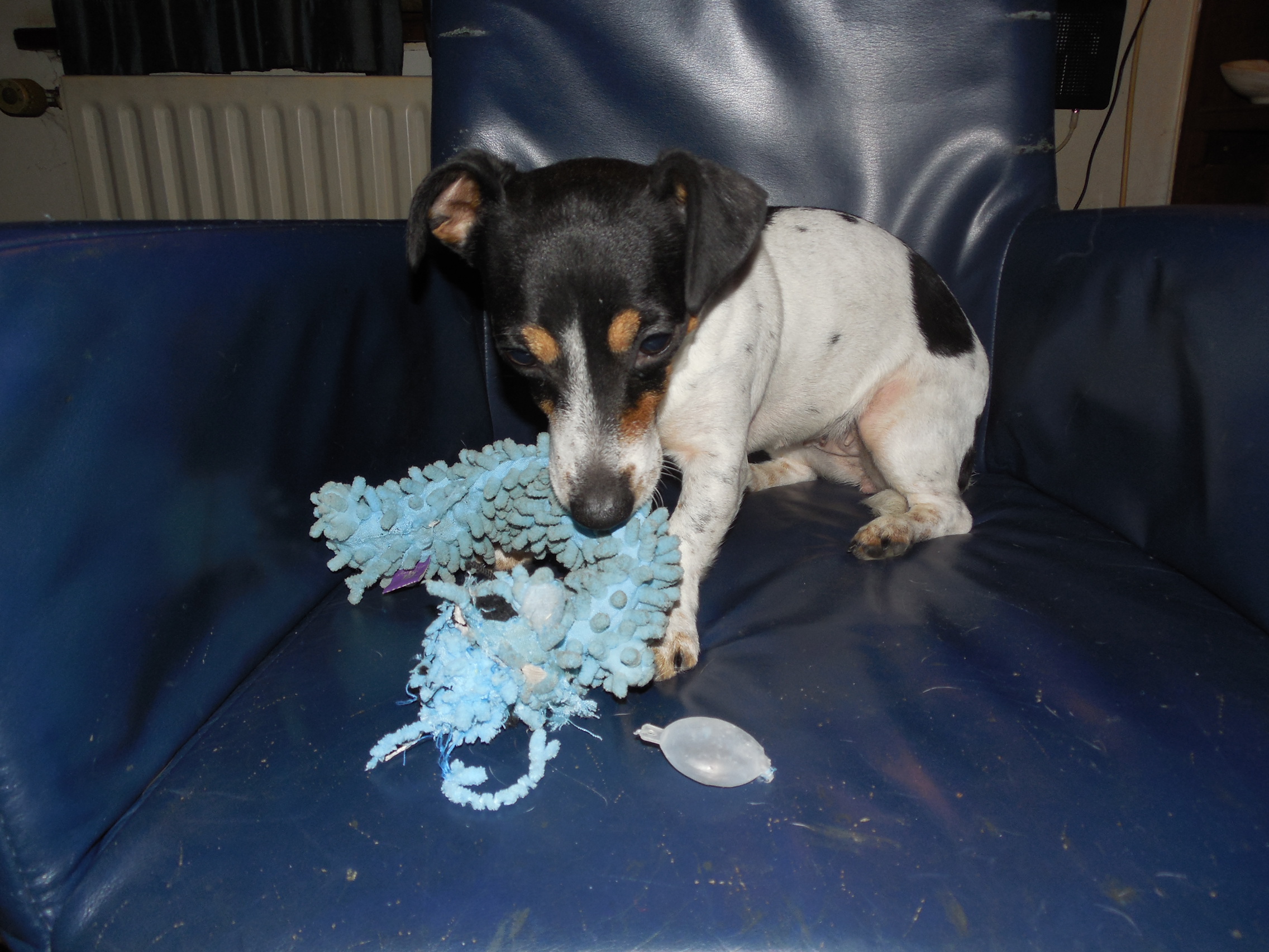 2015 01 23_4750She managed to wait 3 days before ripping the squeaker out of “Blue Dog”. That’s a record in this house. Jansen usually had them disemboweled of their squeakers within 15 minutes.